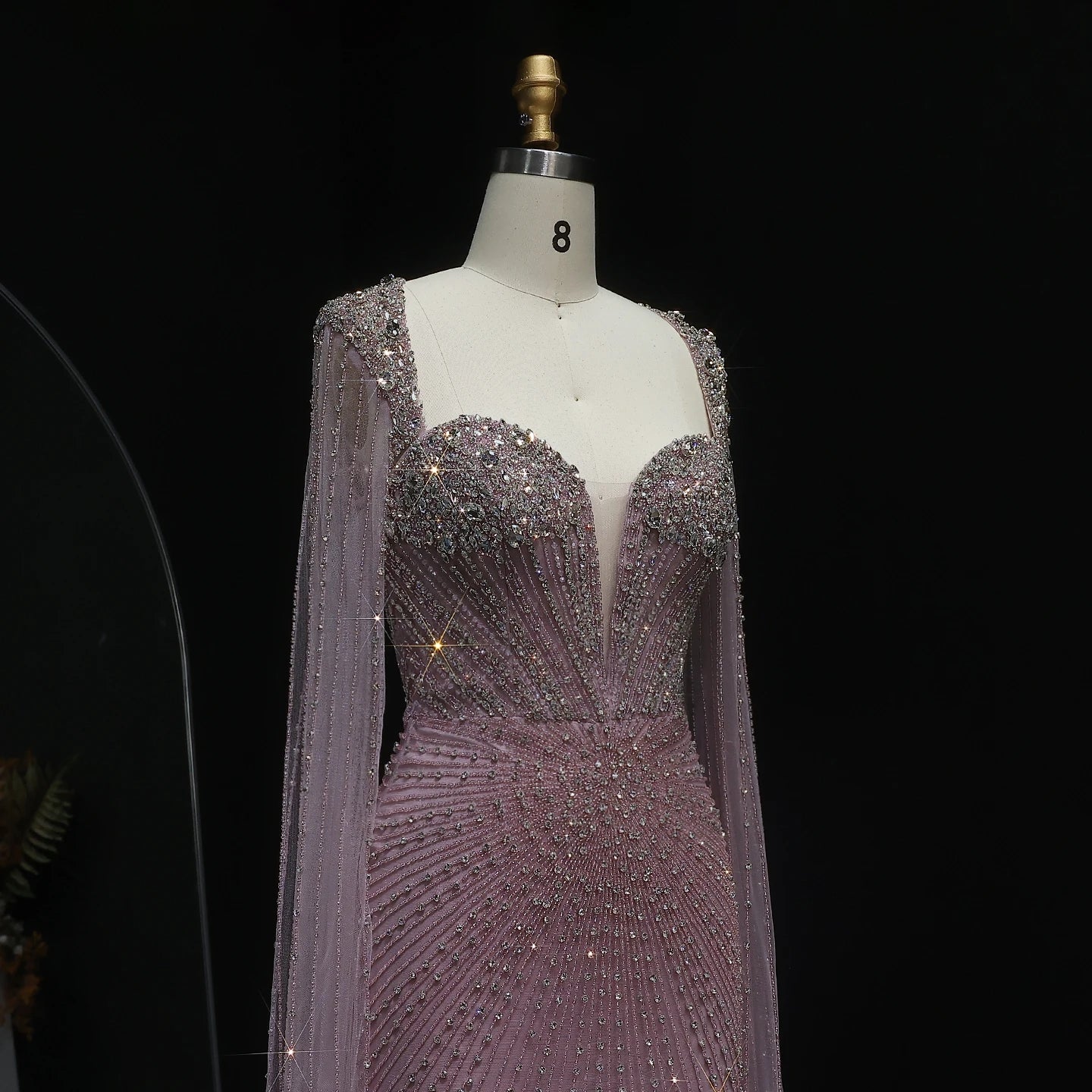Beaded Nude Dubai Dress with Cape Sleeves Pink Arabic Gown SS194