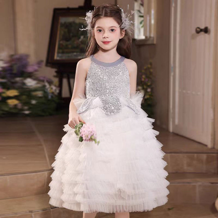 Elegant Halter-Neck Sequined Tulle Girl Dress Sleeveless White J431