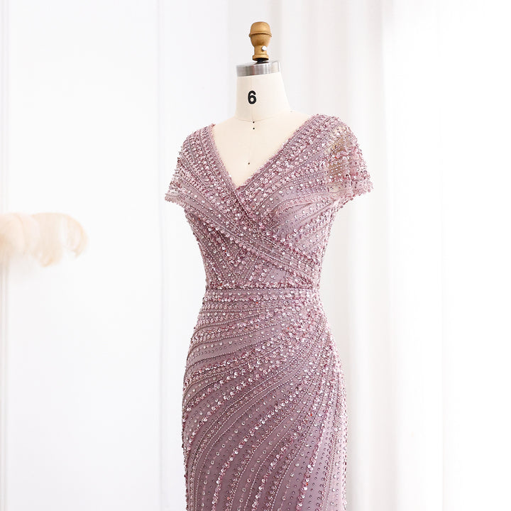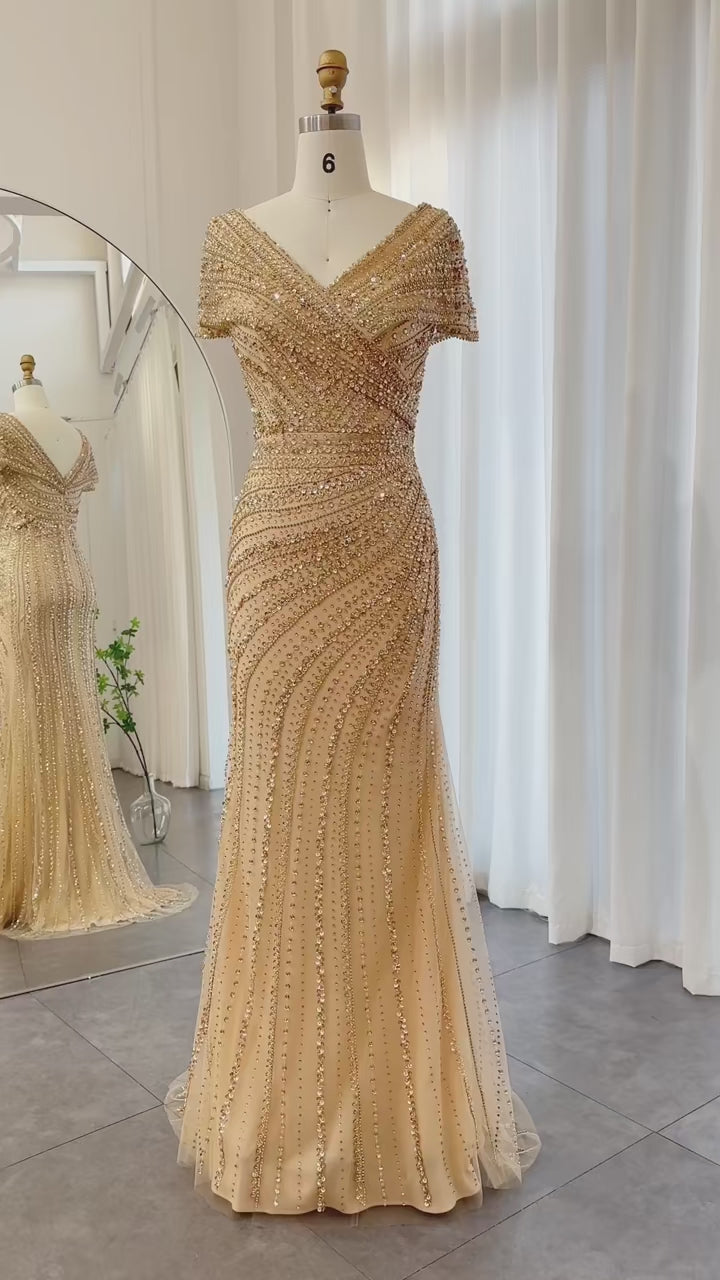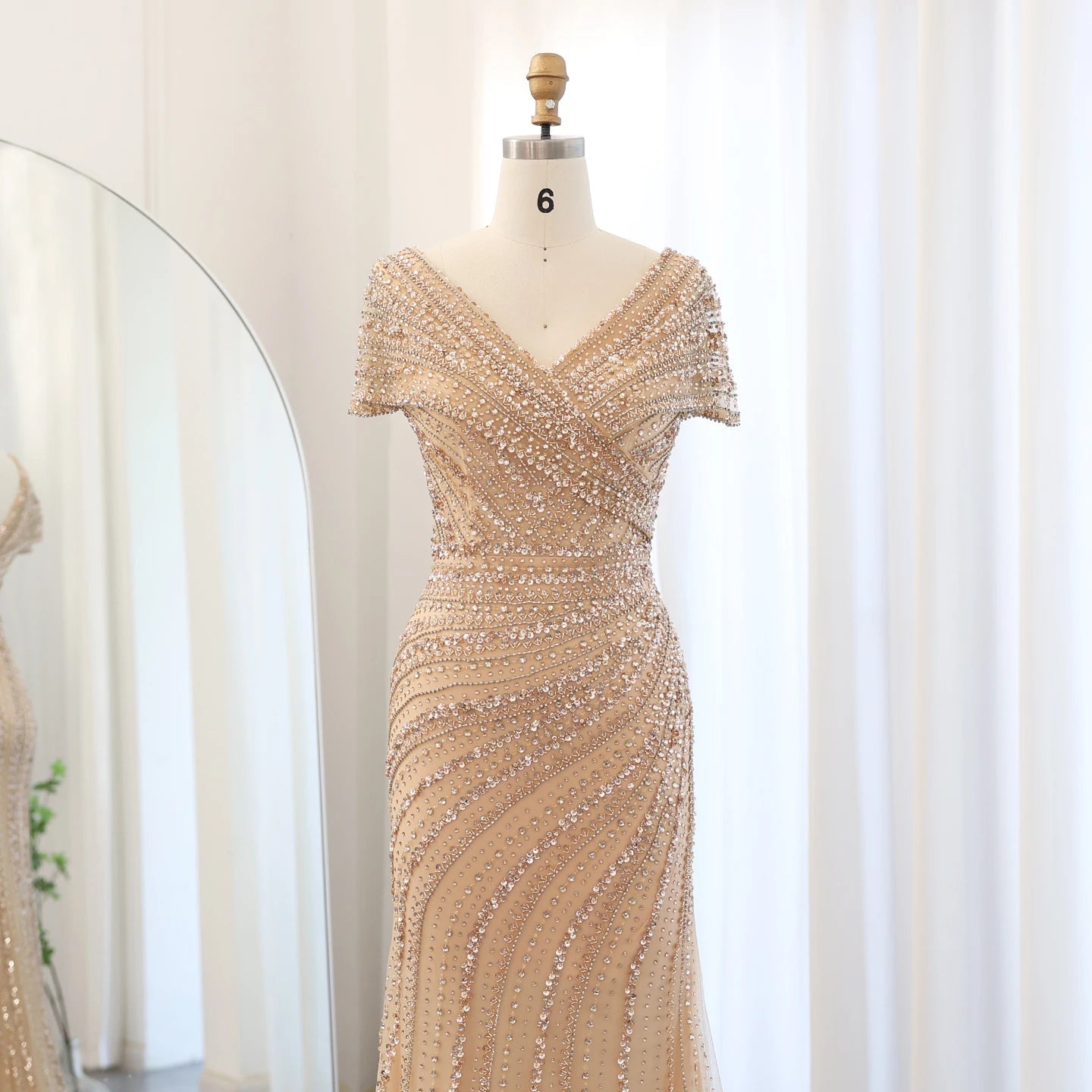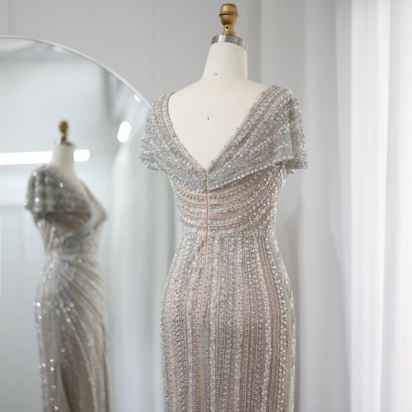 Indulge in luxury with Dreamy Vow's Dubai Silver Nude Mermaid Evening Dress. This elegant gown features cap sleeves and a flattering mermaid silhouette, perfect for weddings and formal parties. Made with high-quality materials, it exudes opulence and sophistication. Make a statement with Dreamy Vow.