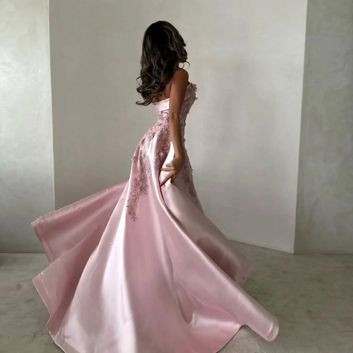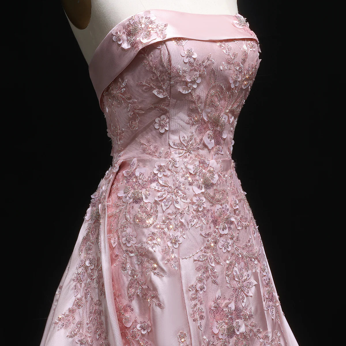 Indulge in timeless elegance with this stunning blush pink evening dress, designed for the discerning bride or formal occasion guest. The strapless silhouette showcases a refined bodice that gracefully transitions into a flowing skirt, while the dramatic overskirt adds dimension and movement. Crafted with meticulous attention to detail, this gown features luxurious fabric that drapes beautifully and catches light with every step. Perfect for creating an unforgettable entrance at your most cherished celebrations. A sophisticated choice for those who appreciate understated luxury and impeccable craftsmanship.